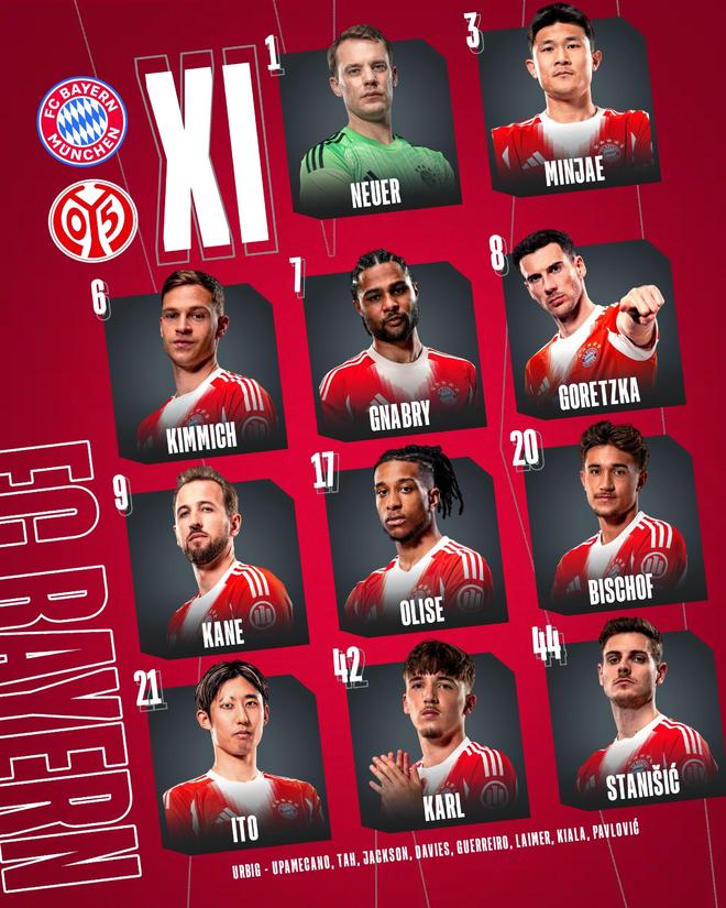 拜仁vs美因茨:凯恩领衔,伊藤洋辉、金玟哉、卡尔出战